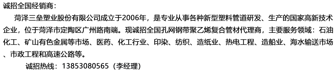 菏澤三壘塑業(yè)股份有限公司專業(yè)從事各種新型塑料管道研發(fā)和生產(chǎn),重點研發(fā)了孔網(wǎng)鋼帶聚乙烯復合管材